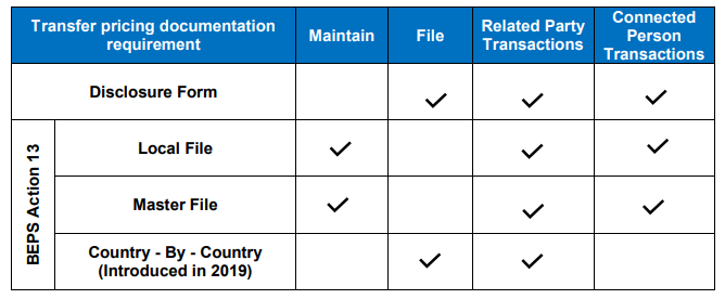 - Businesses will also need to maintain a three-tier documentation (Local File, Master File and Country-by-Country Report) in line with OECD BEPS Action 13 requirements, where the arm’s length value of their Related Party Transactions exceeds a certain threshold in the relevant tax period.